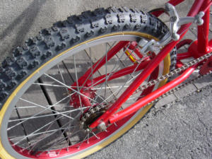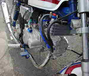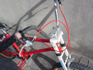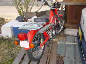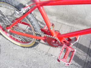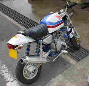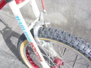 | 一言:MARUISHI MONTESA 1980年代にトライアルの全日本チャンピオンだった丸山さんのお店にあったらしいBTR。 しっかりとしたフレームの作りで、回転部分がすべてノーシールド。メンテナンスオタクのオーナーには鼻をふくらませるバイク。当時、尾道市のオーナーが、市街の山坂、公園のベンチを登ったり降りたりして楽しんでた逸品。笠岡市の番町を走るには、かなり足を回す必要がある。 |